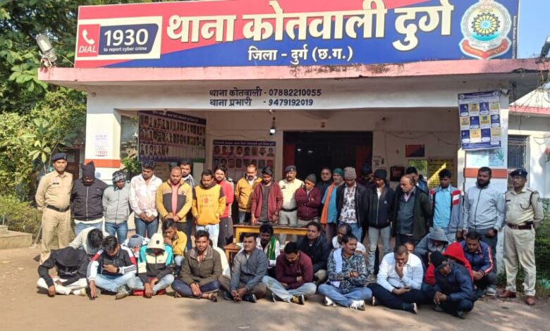 दिनांक 17.11.2025 को मुखबिर सूचना मिली कि भागवत देशमुख के घर गया नगर कोस्टा तालाब के पास दुर्ग में कुछ लोग ताश पत्ती से रूपये पैसे से हारजीत का दाव लगाकर जुआ नामक खेल खेल रहे हैं कि सूचना पर मौके पर पहुंचकर घेराबंदी कर रेड कार्यवाही कर जुआड़ियान जुआ खेलते हुए पकड़ाये। 39 जुआड़ियान के कब्जे से 04 नग 52 पत्ती तास, 43 नग विभिन्न कंपनी का मोबाईल कीमती 2,05,000/- रूपये एवं नगदी रकम 9,25,200/- रूपये कुल जुमला 11,30,200/- रूपये को गवाहो के समक्ष जप्त कर कब्जा पुलिस लिया गया आरोपीगण का कृत्य धारा सदर का पाये जाने से विधिवत गिरफ्तार किया कर विधिवत् कार्यवाही कर अपराध पंजीबद्ध कर विवेचना में लिया गया।