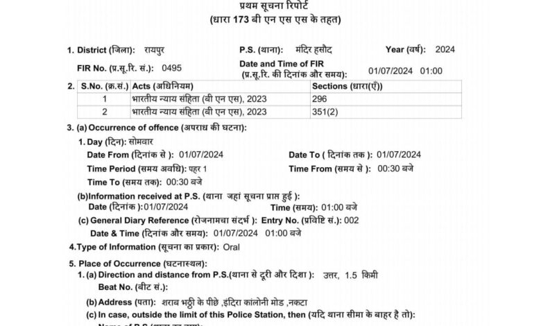 रायपुर के थाना मन्दिर हसौद में नए अपराधिक कानून के अनुसार प्रार्थी नोहर दास रात्रे की रिपोर्ट पर अनावेदक अमित सिंह राजपूत के विरुद्ध अपराध क्रमांक 495/24 गाली गलौच और जान से मारने की धमकी, धारा 296, 351(2) भारतीय न्याय संहिता (बीएनएस) के तहत अपराध पंजीबद्ध किया गया है। पहले यह 294, 506 आइपीसी के तहत दर्ज होता था।