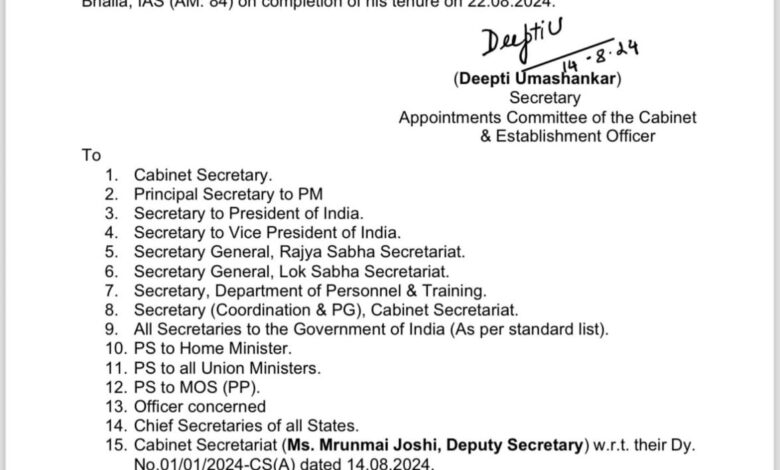 अजय कुमार भल्ला,आईएएस (एएम: 84) के स्थान पर गृह सचिव, गृह मंत्रालय का पदभार संभालेंगे।