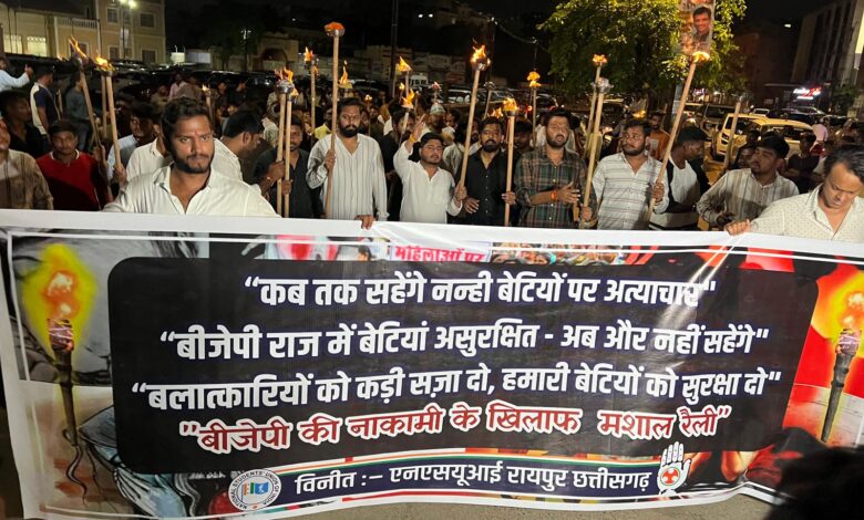 स्कूल पढ़ने वाली 4 साल की बच्ची से छेड़छाड़, भिलाई में युवती और राजधानी में अधेड़ महिला के साथ गैंगरेप का मामले को NSUI कार्यकर्ताओं ने मशाल रैली निकालकर जताया विरोध