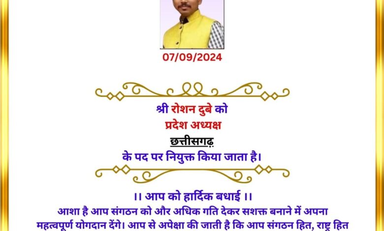 राष्ट्रीय हिंदू वाहिनी संगठन में छत्तीसगढ़ के प्रदेश अध्यक्ष बने रोशन दुबे