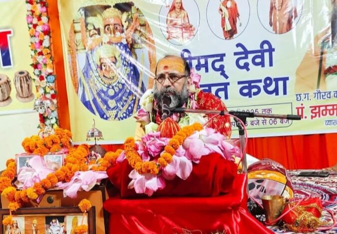 रतनपुर- महामाया मंदिर प्रांगण में चल रही श्रीमद् देवीभागवत महापुराण कथा में कथा व्यास पूज्य आचार्यश्री झम्मन प्रसाद शास्त्री ने कहा कि मां भगवती प्रकृति स्वरूप हैं और हमें कण-कण से परोपकार की शिक्षा मिलती है।