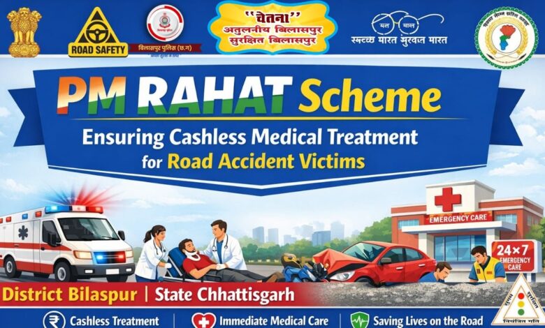सड़क दुर्घटनाओं में घायल व्यक्तियों को त्वरित एवं गुणवत्तापूर्ण चिकित्सा सुविधा उपलब्ध कराने हेतु भारत सरकार द्वारा “प्रधानमंत्री – सड़क दुर्घटना पीड़ित अस्पताल में भर्ती और सुनिश्चित उपचार (PM-RAHAT) योजना” लागू की गई है। इस योजना का मुख्य उद्देश्य दुर्घटना के बाद ‘गोल्डन ऑवर’ (पहले एक घंटे) में पीड़ितों को निःशुल्क एवं तत्काल उपचार सुनिश्चित करना है, जिससे अधिक से अधिक जीवन बचाए जा सकें।