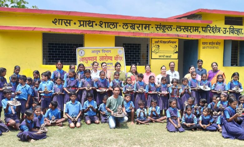 रतनपुर- आयुष्मान आरोग्य मंदिर लखराम द्वारा प्राथमिक शाला लखराम में इको फ्रेंडली हर्बल बीज युक्त गणेश बनाने का प्रशिक्षण दिया गया । इस कार्यशाला का मुख्य उद्देश्य बच्चों में पर्यावरण के प्रति जागरूकता लाना है।डॉ रश्मि जितपुरे ने बताया कि हर्बल बीज युक्त गणेश की प्रतिमा द्वारा बच्चों में उनकी क्रिएटिविटी व प्रकृति से संपर्क बनाना है इको फ्रेंडली गणेश बनाने से पर्यावरण संरक्षण होता है मिट्टी की उर्वरता समाप्त नहीं होती व हमारा स्वास्थ्य अच्छा रहता हैं।।मूर्ति बनाने का प्रशिक्षण श्रीमती रश्मि चौहान और ओमप्रकाश प्रजापति द्वारा दिया गया । पाठक सोनू सूर्यवंशी ने बच्चों के संपूर्ण विकास के लिए इस तरह की एक्टिविटीज को करवाना प्रोत्साहित किया डॉक्टर रेखा जग्गा द्वारा होम्योपैथी चिकित्सा के द्वारा वर्षा ऋतु में स्वयं के देखभाल किस तरह से की जाए इसकी जानकारी दी गई । डॉ श्वेता मार्को द्वारा योग के बारे में बताया गया। बच्चों की संख्या कल 110 रही। इस शिविर को सफल बनाने में प्रधान पाठक,तिवारी, औषधालयीन कर्मचारी गण ऋतु बर्मन, खिलेश्वर प्रसाद, अनिल केवट का सहयोग रहा । इस कार्यक्रम में बच्चों ने बढ़कर भाग लिया और सभी ने इसका लाभ उठाया। यह शिविर डॉ रश्मि जितपुरे द्वारा संपन्न कराया गया।